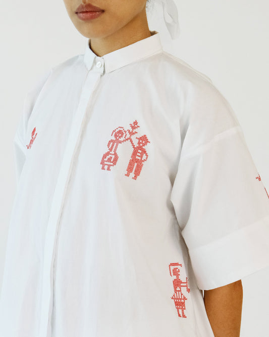 White and Red Cross Stitch Embroidery Cotton Shirt Skirt Set of 2