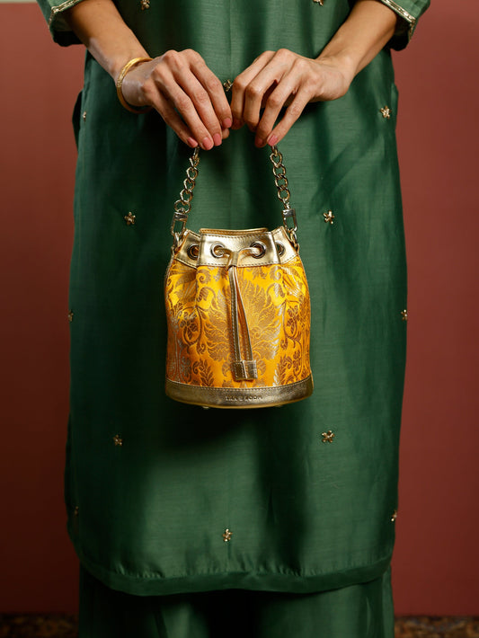 The Veda Potli Bag - Beige Kosa Silk & Leather with Zardozi & Handmade Tassel Bunches
