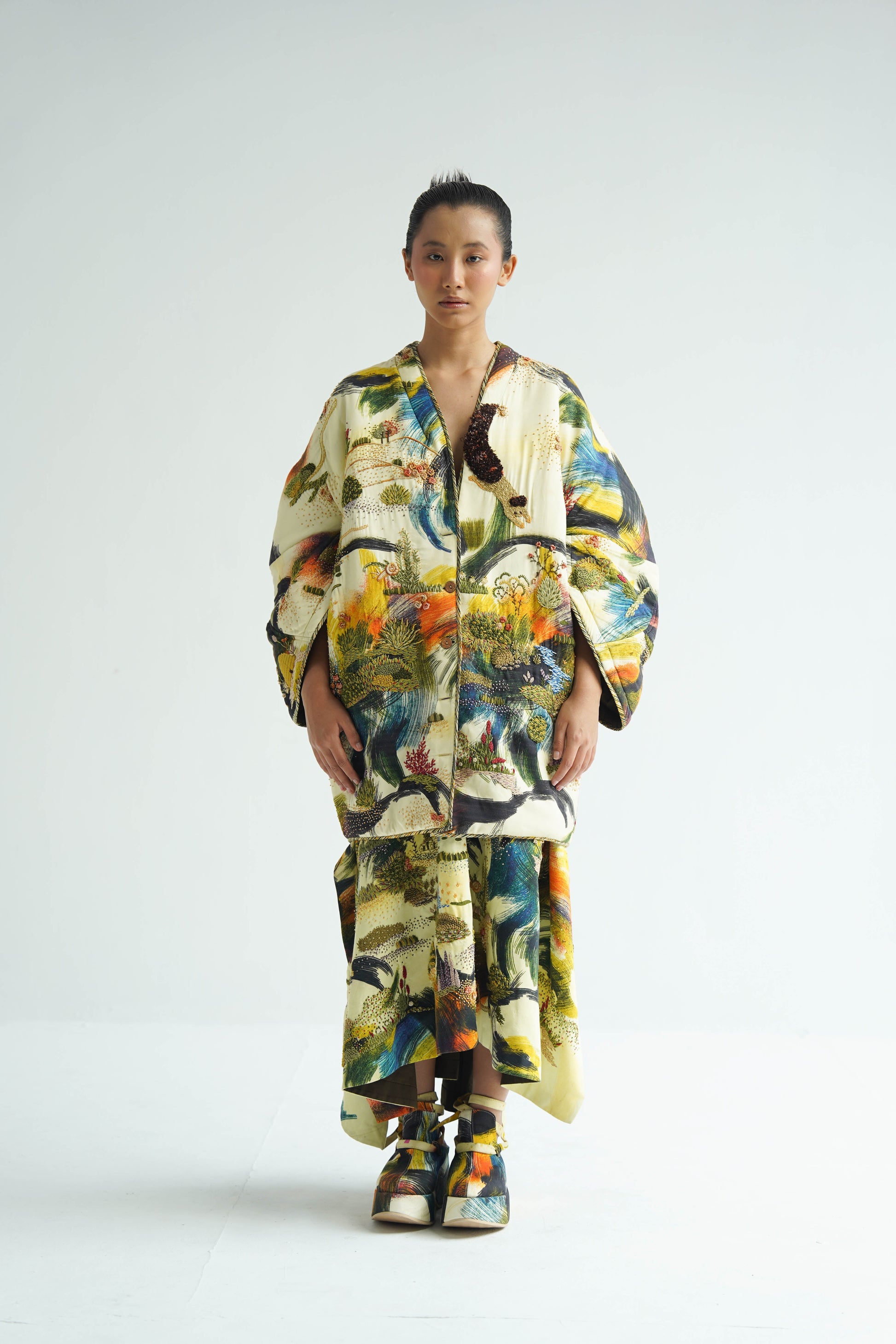 This dreamscape quilted skirt made in soft cotton fabric is a comfortable and structured silhouette. It is finished full hand embroidery creating a captivating 3d texture with proper finishing and stitching
