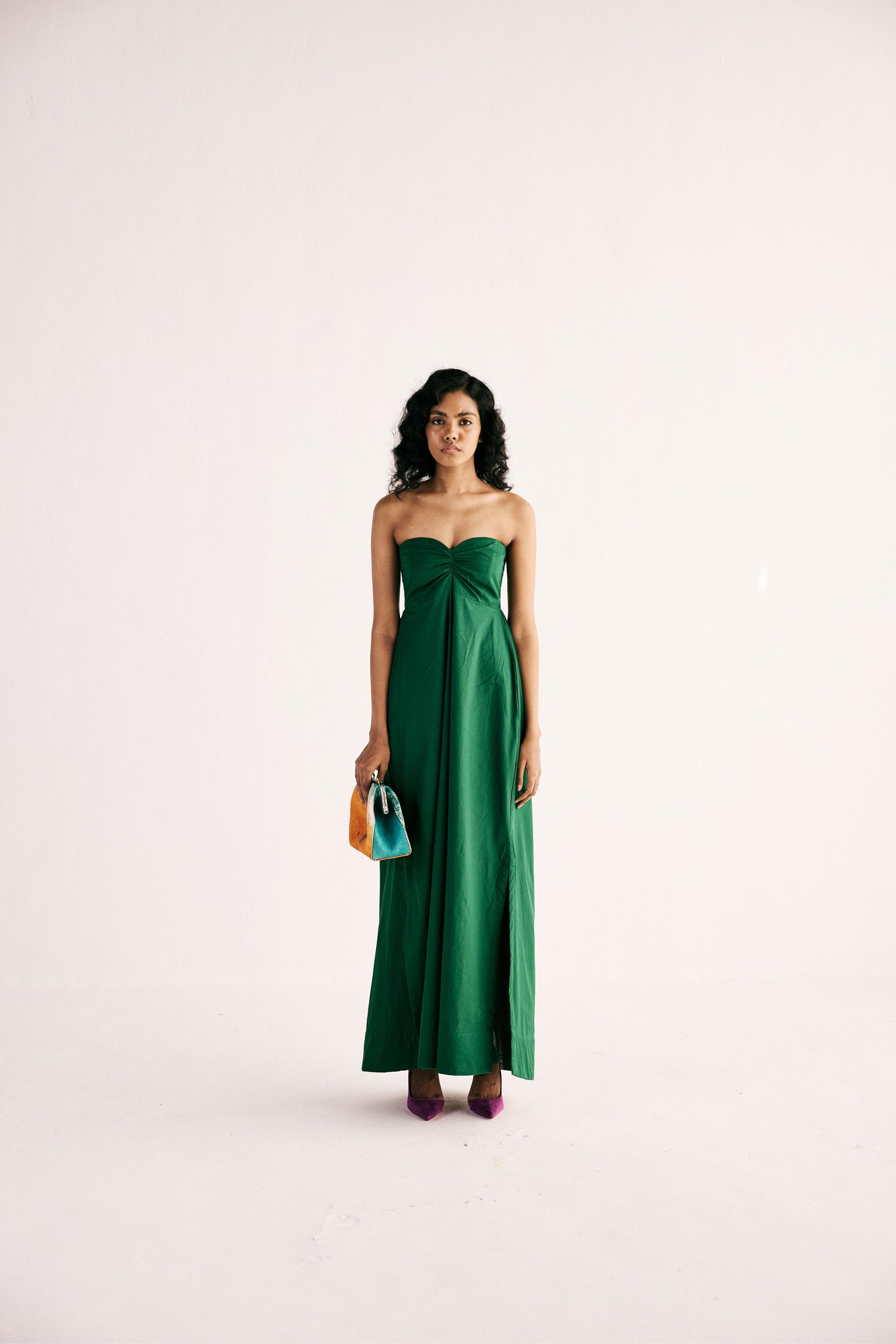 An elegant off shoulder emerald green gown crafted in breathable poplin, with fitted bust and elasticated back featuring double side slits and a peekaboo ikat contrast lining. comes with detachable straps. Off shoulder.