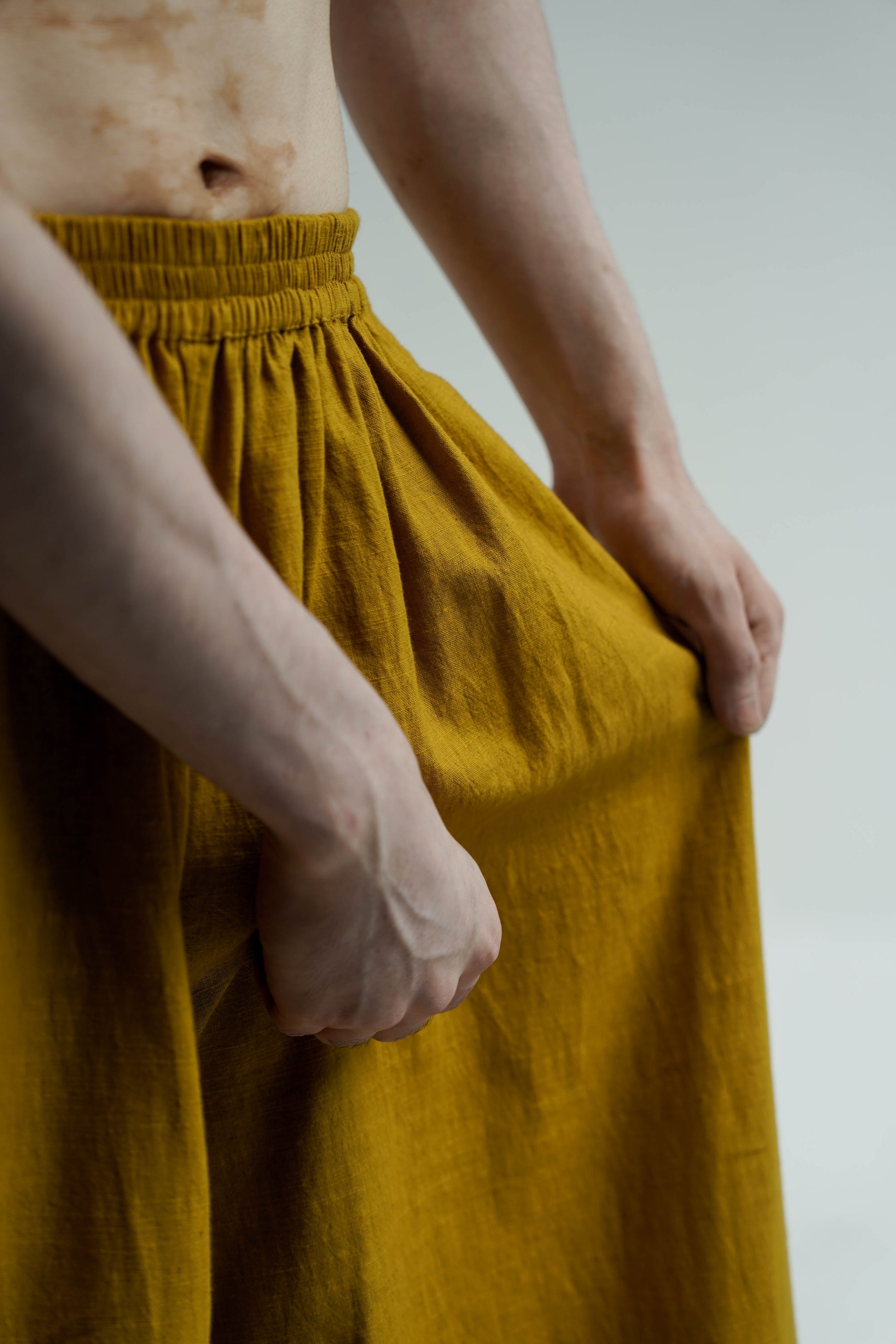 This Lime yellow trouser, crafted from cotton , showcases a hand-dyed lime hue. It's elasticated at the waist and is relaxed fit suitable for all genders.