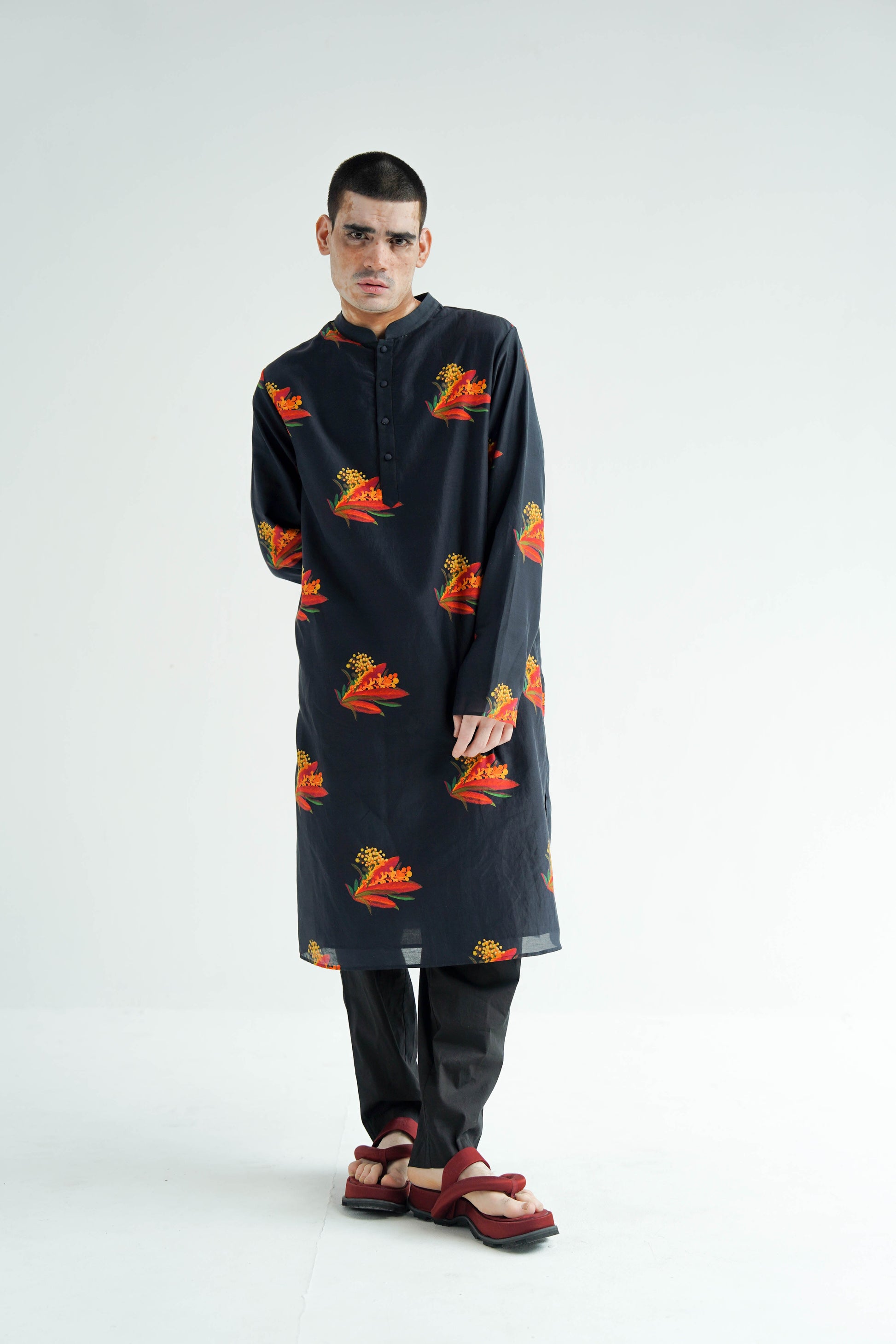 This ensemble is meticulously crafted in silk, paired with digitally printed cotton relaxed fit pants marrying luxury with comfort. Designed for a relaxed fit that exudes ease and comfort. This nero kurta set is finely tailored and finished.