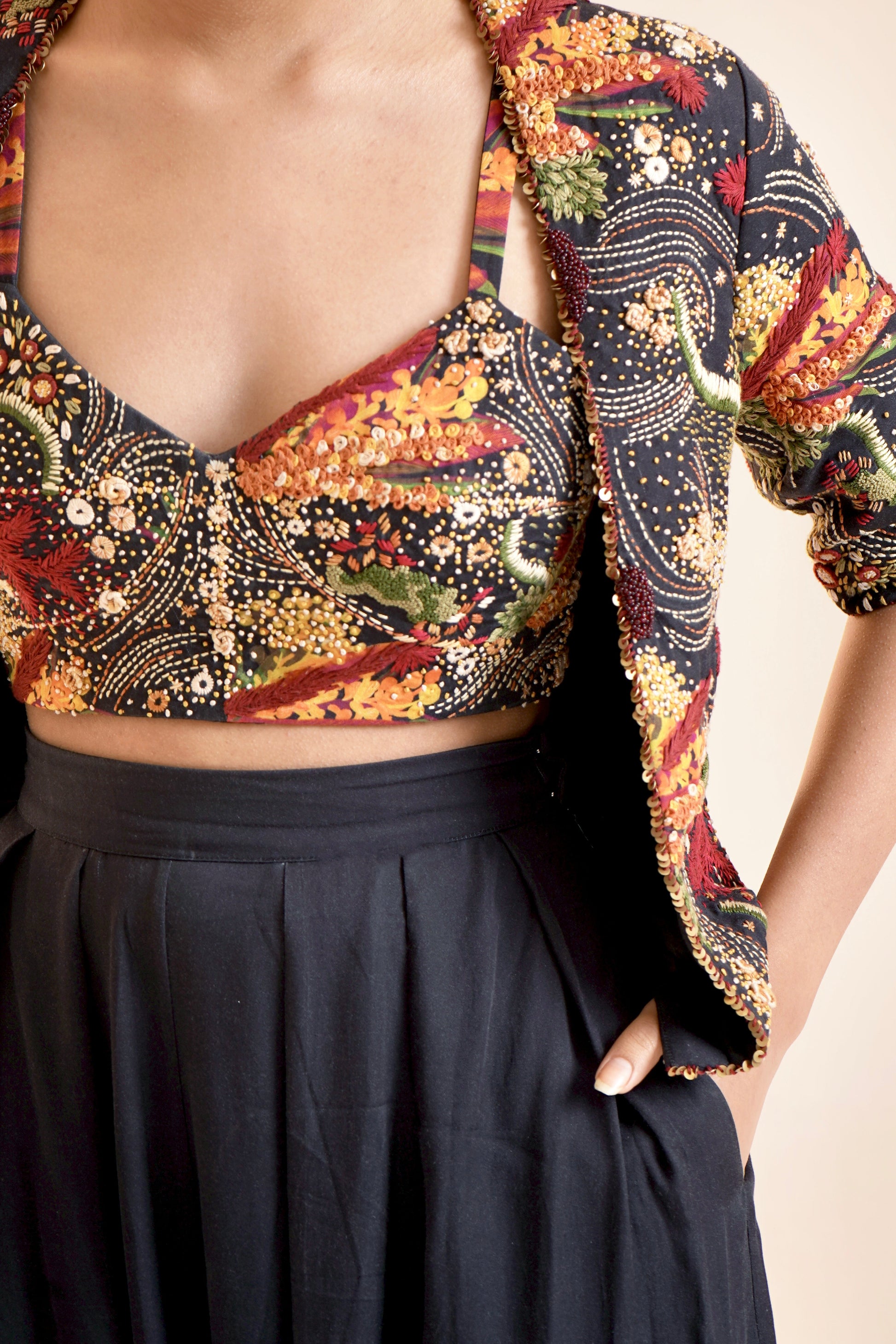 Black firefly printed easy relaxed fit trousers are made in soft cotton. it is relaxed fit, tapered at the bottom clean finished.