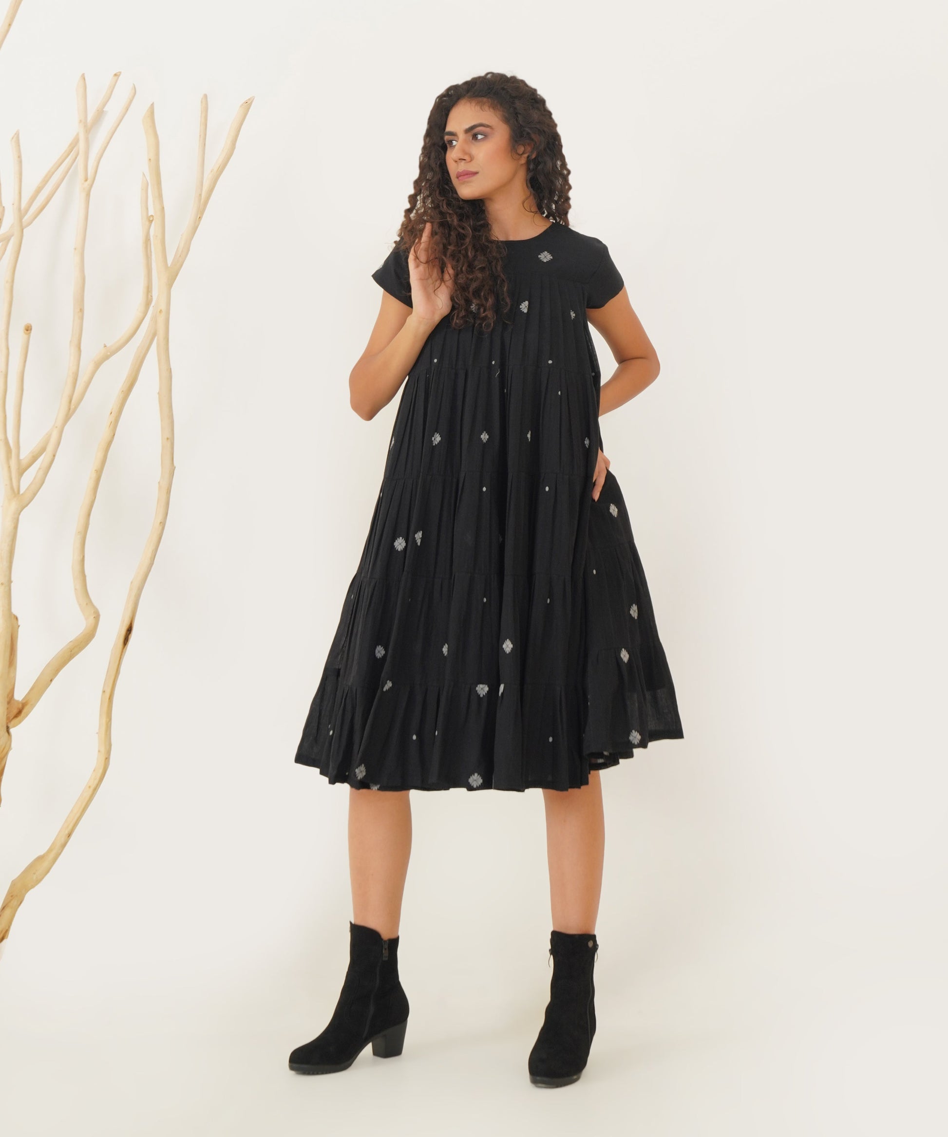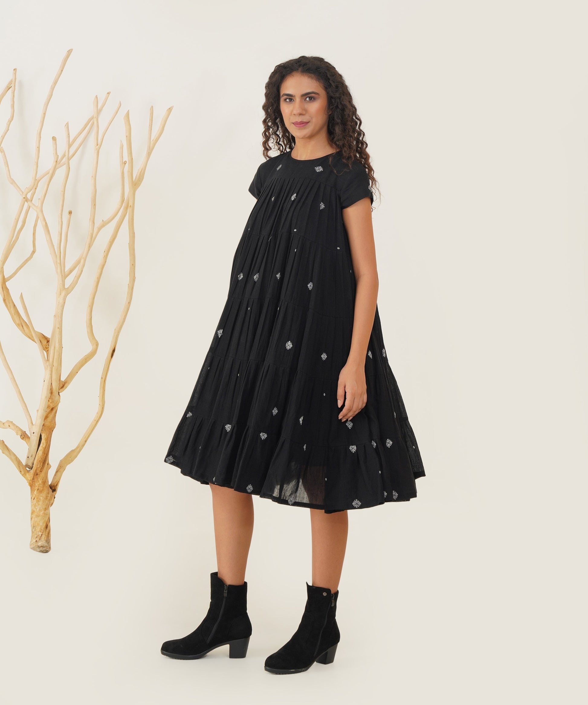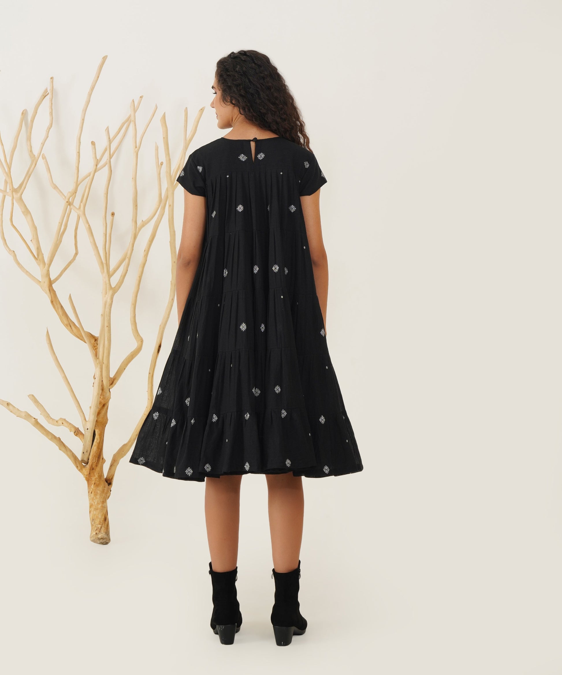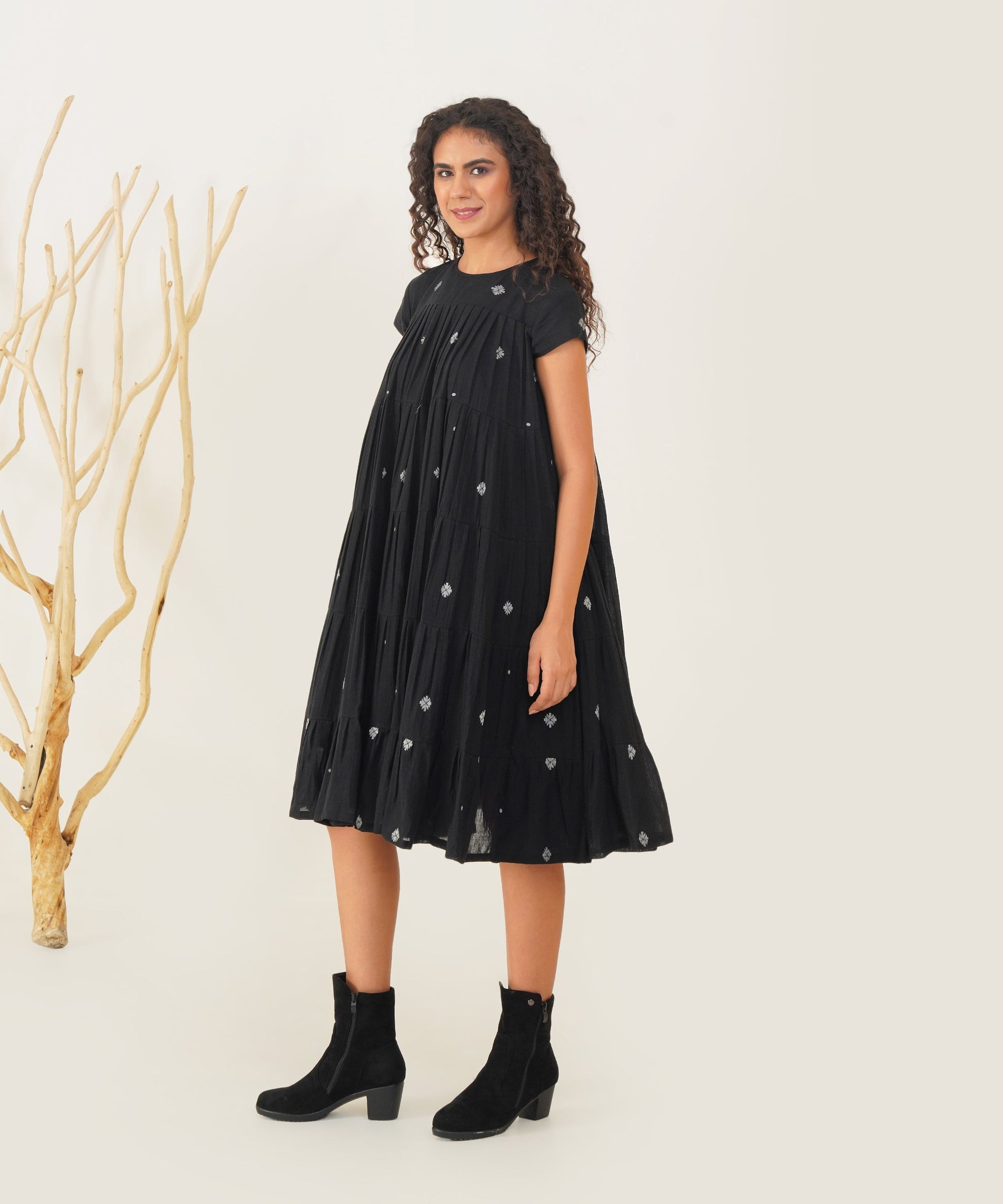 Indulge in the epitome of elegance with our Jamdani swing dress. This enchanting piece features cap sleeves and a gracefully voluminous silhouette that sways with every movement. The gentle gathers enhance its romantic allure, while a delicate keyhole opening at the back adds a touch of sophisticated charm. Perfect for any occasion, this dress effortlessly combines classic refinement with modern flair.