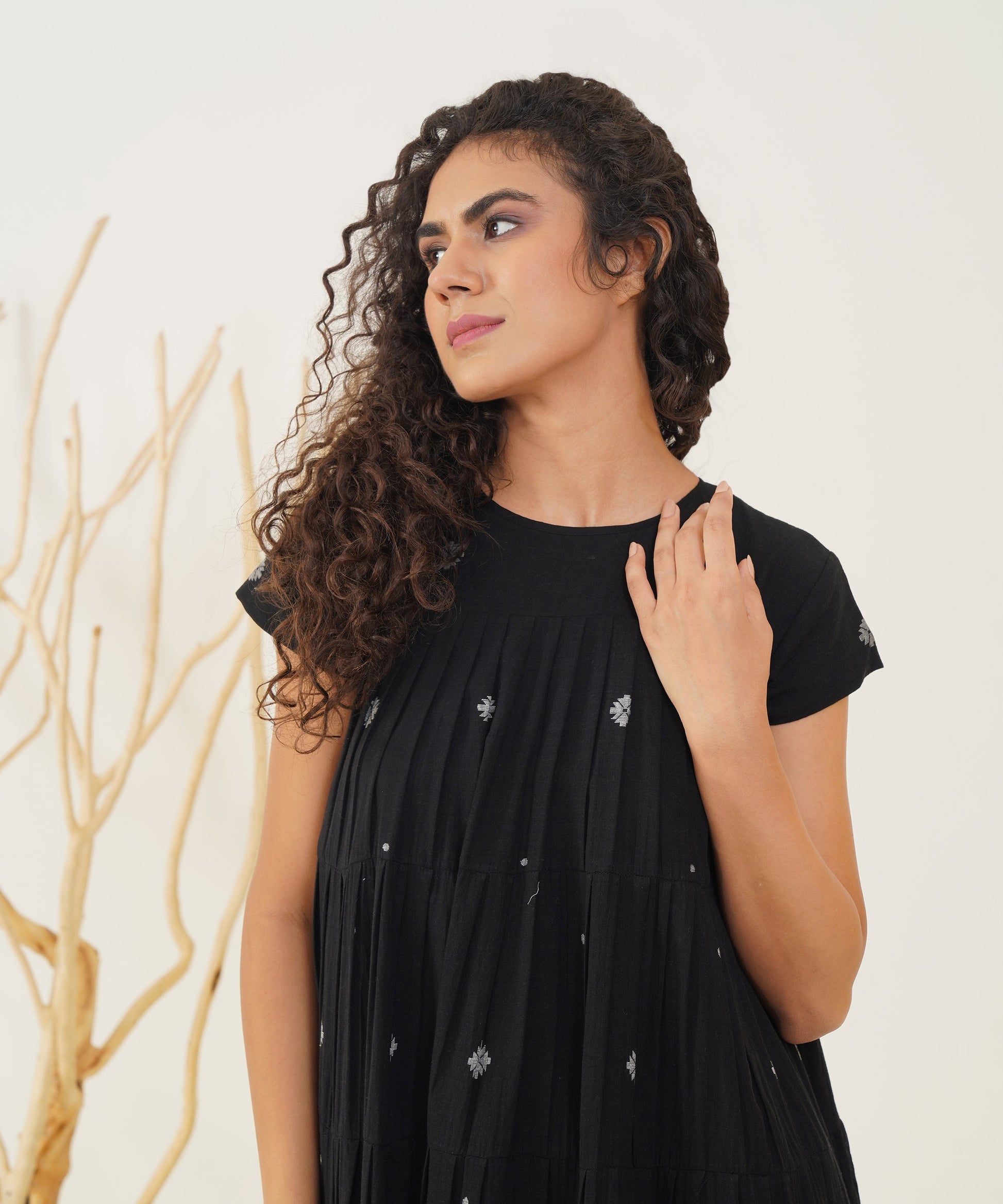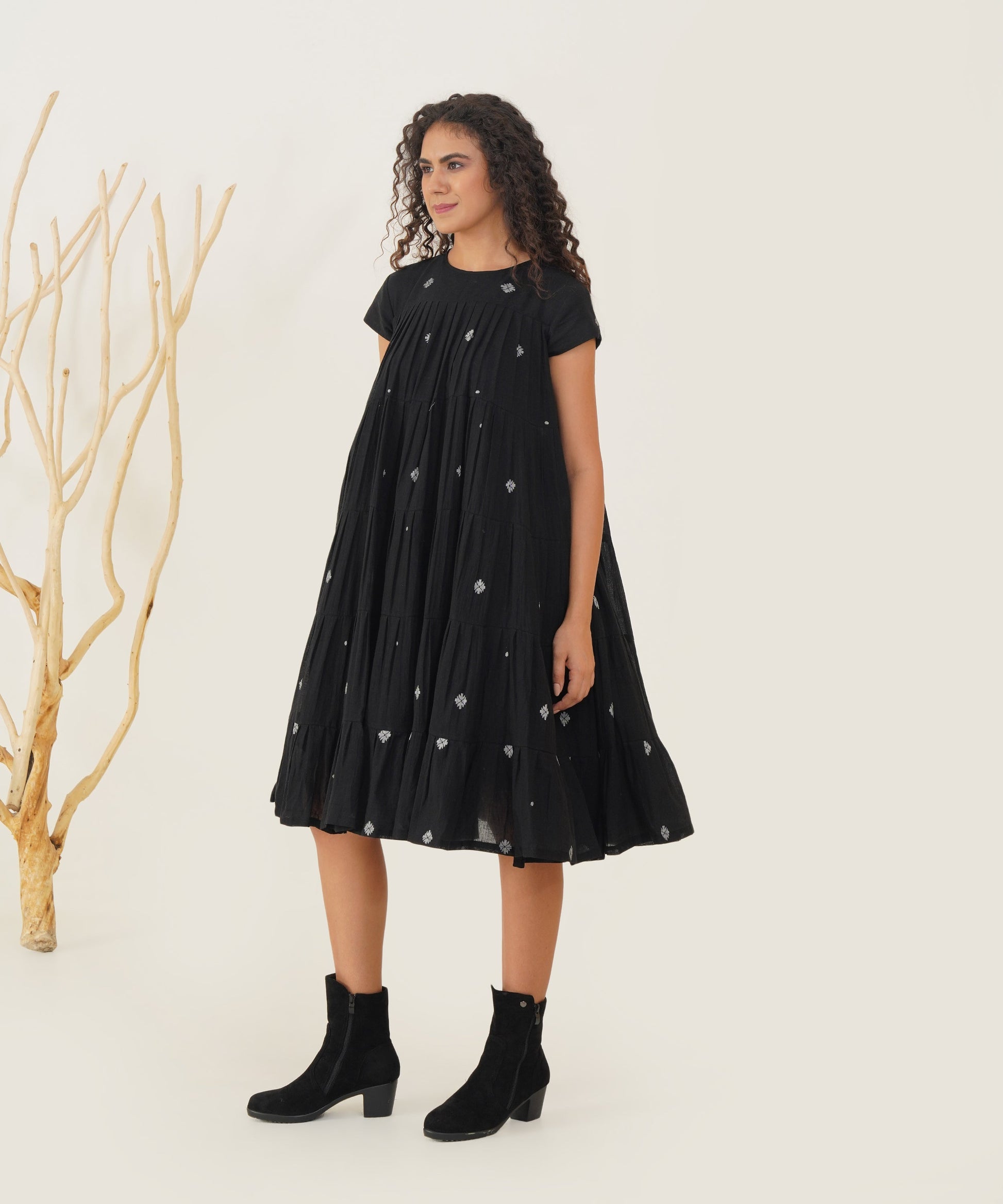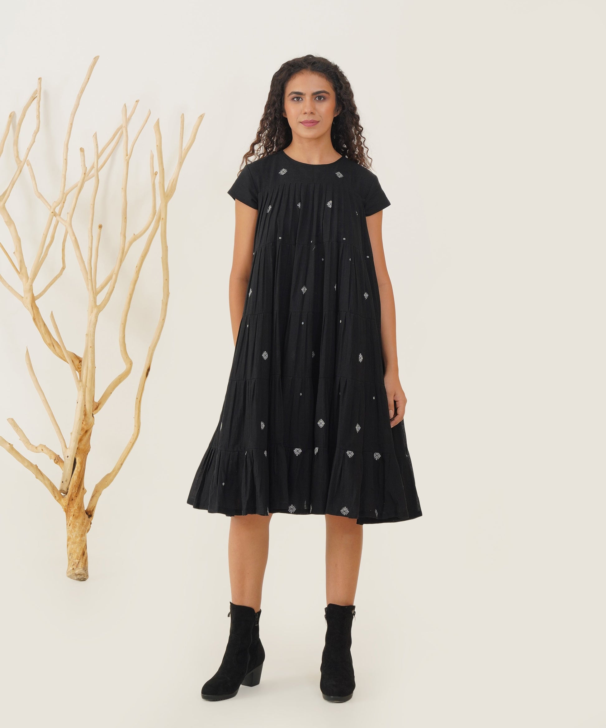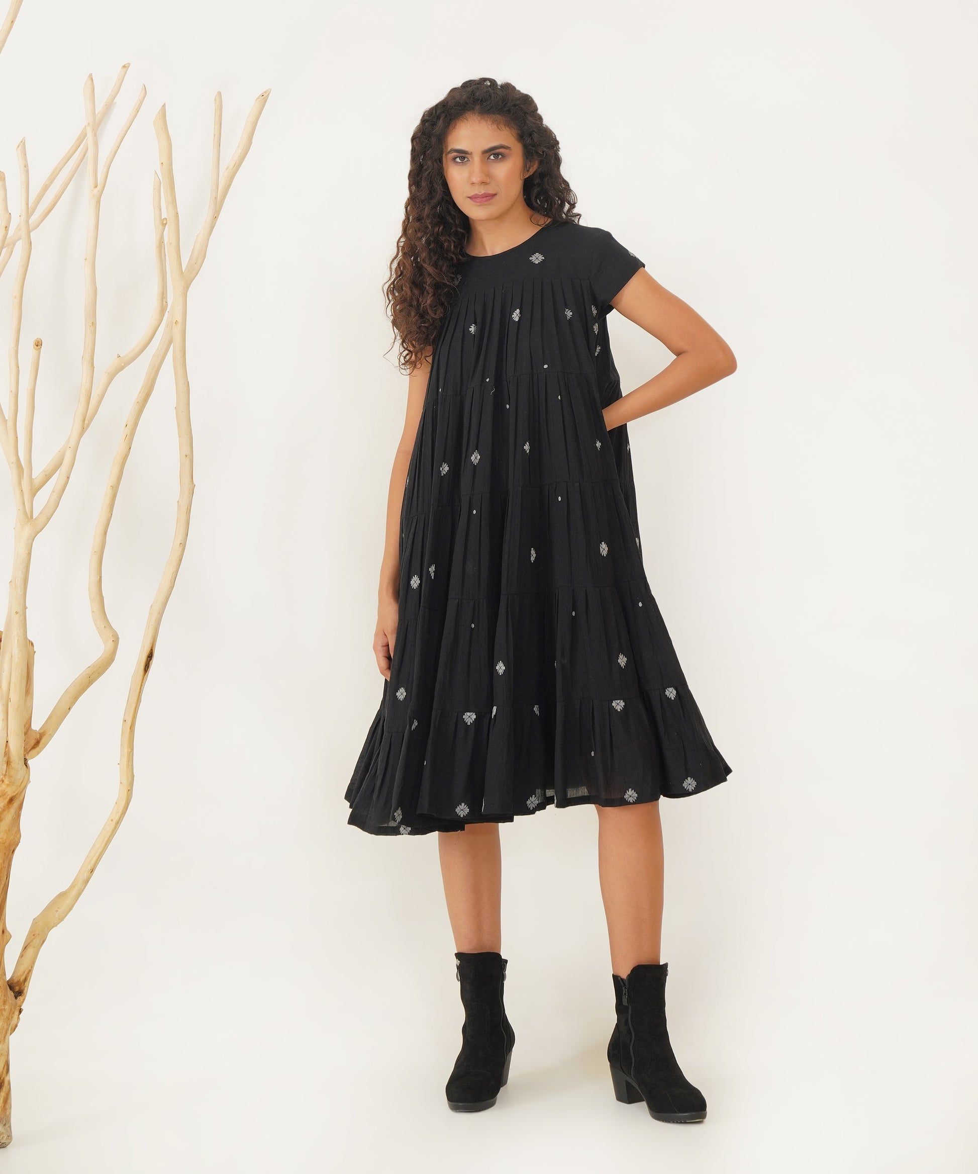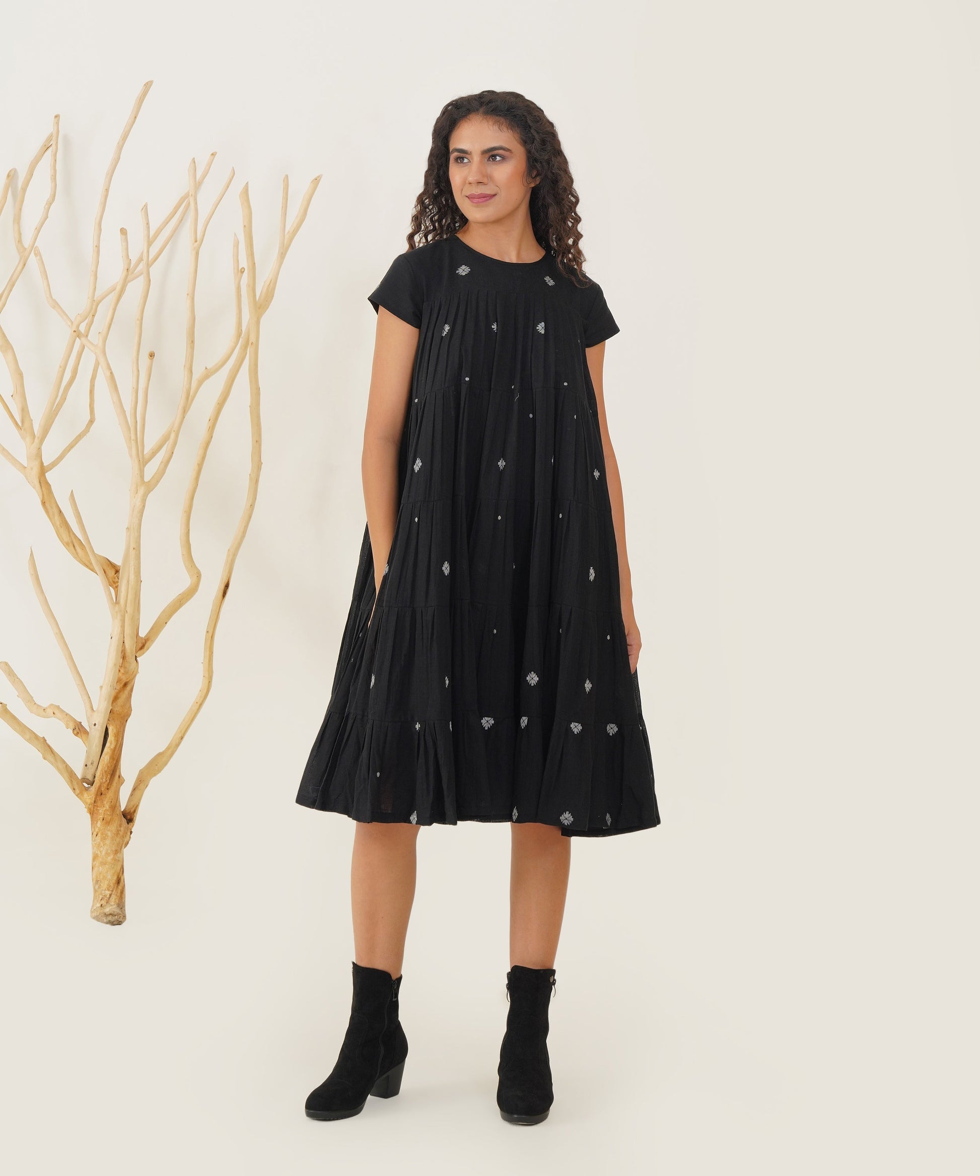 Indulge in the epitome of elegance with our Jamdani swing dress. This enchanting piece features cap sleeves and a gracefully voluminous silhouette that sways with every movement. The gentle gathers enhance its romantic allure, while a delicate keyhole opening at the back adds a touch of sophisticated charm. Perfect for any occasion, this dress effortlessly combines classic refinement with modern flair.