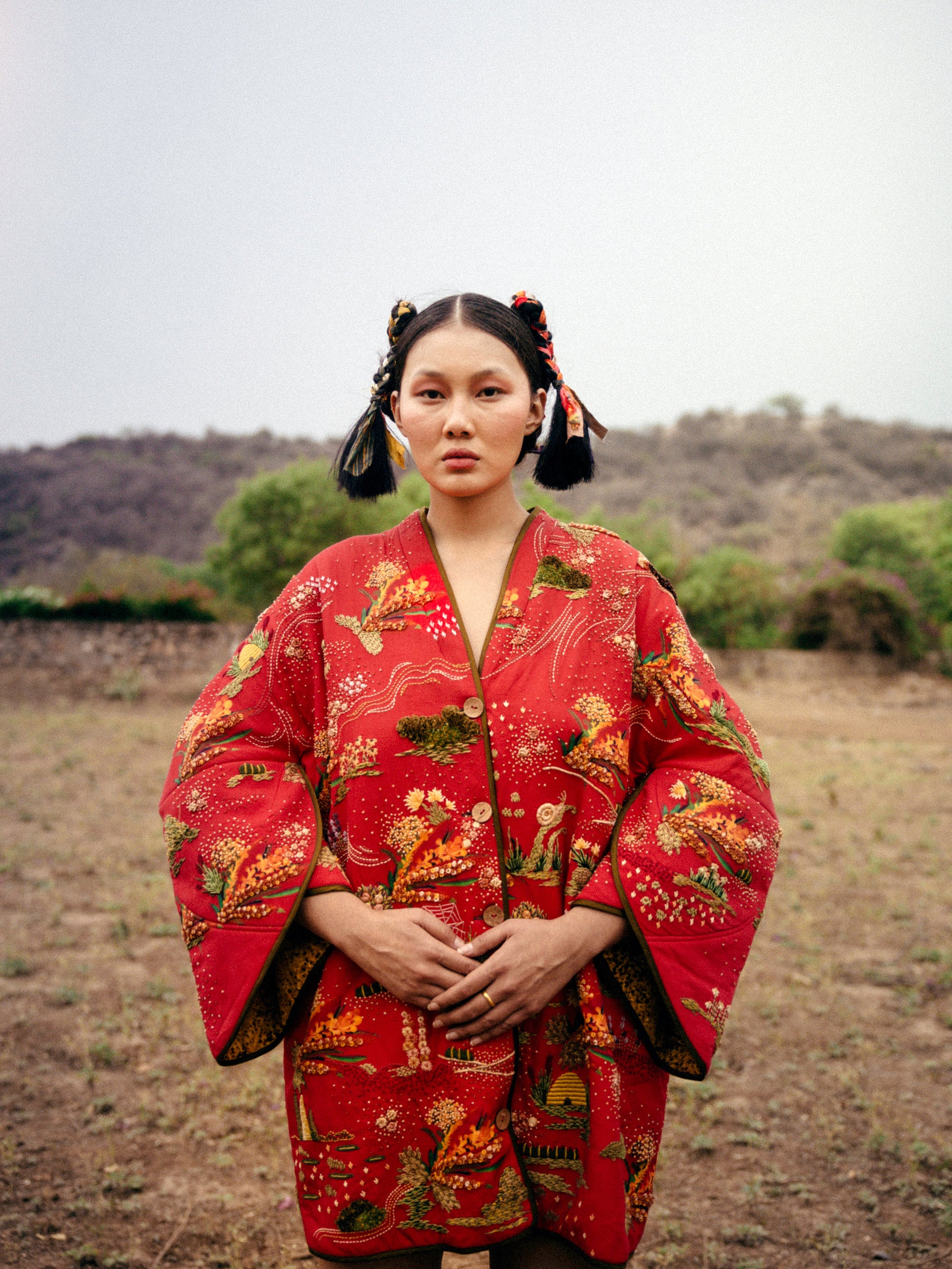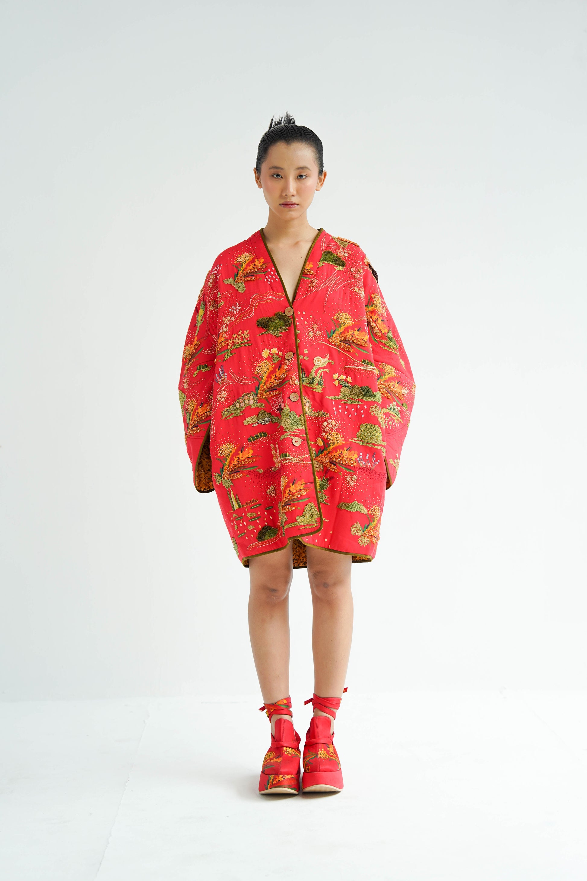 Made in red firefly printed fabric, fully embroidered oversized jacket dress with pockets on both sides with statement sleeve. Finished with contrast piping detail on the edge.