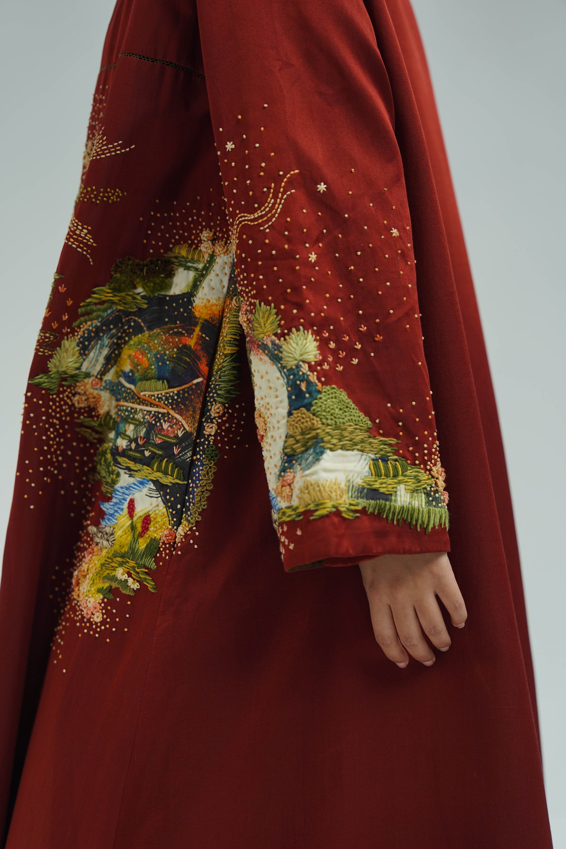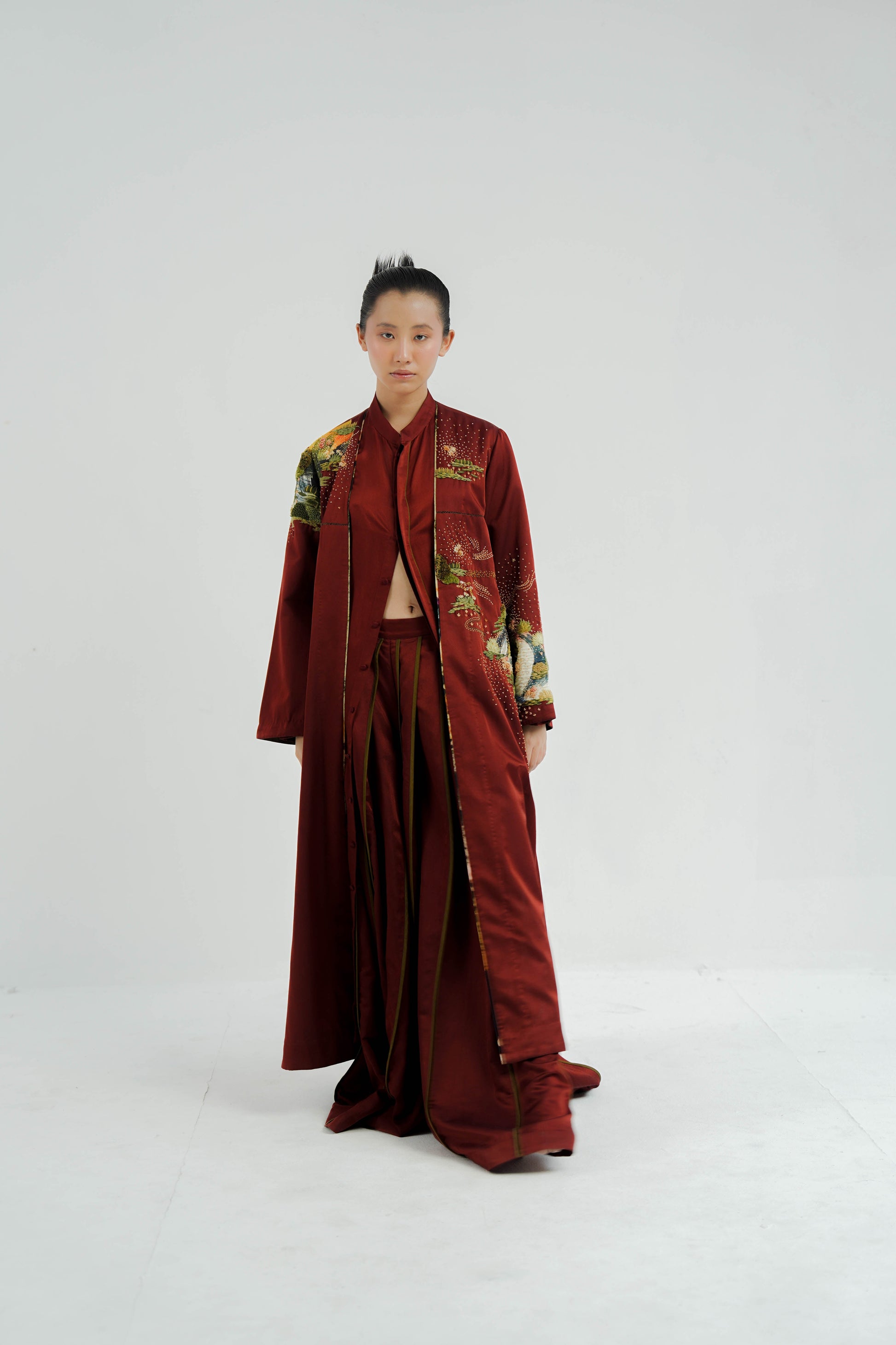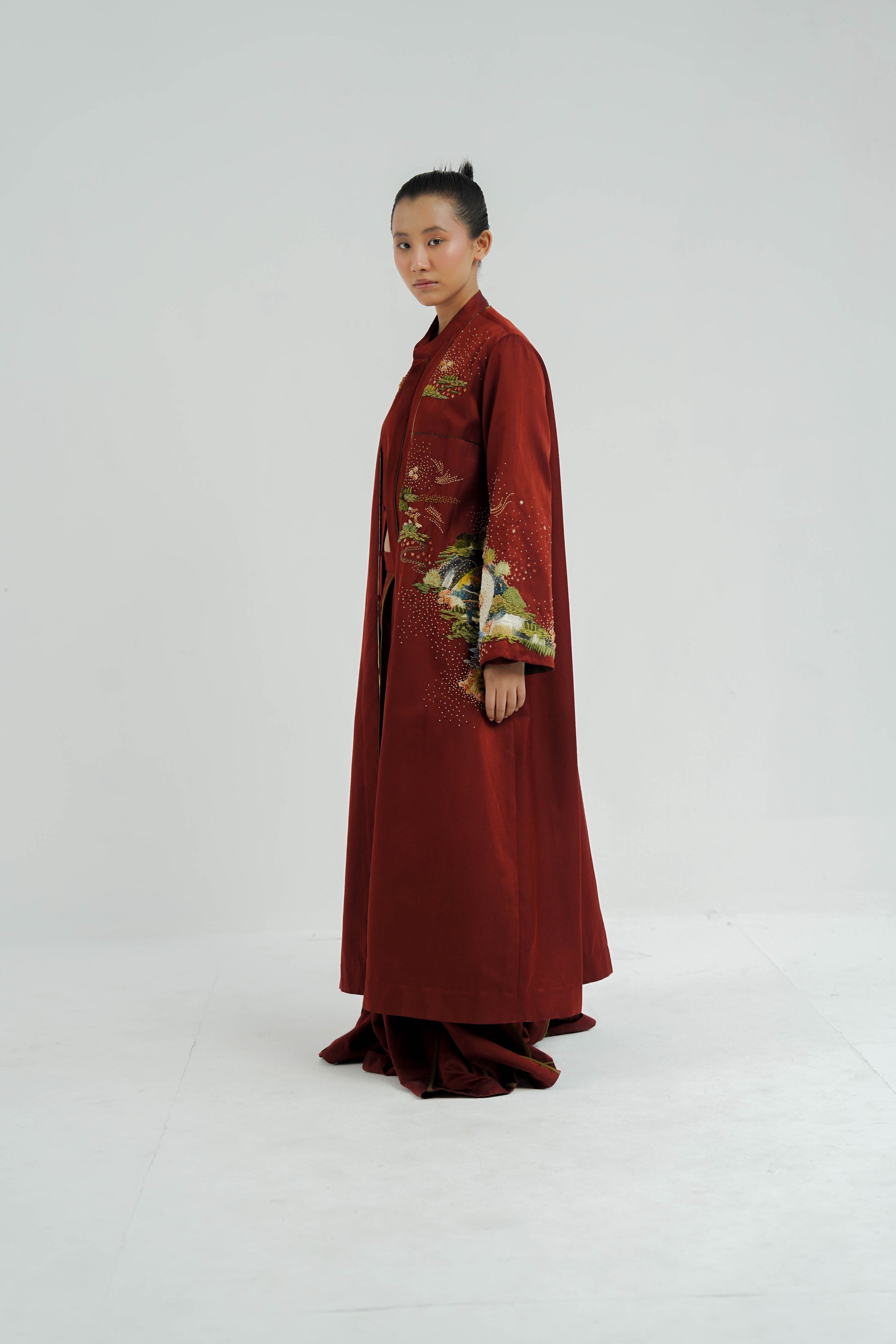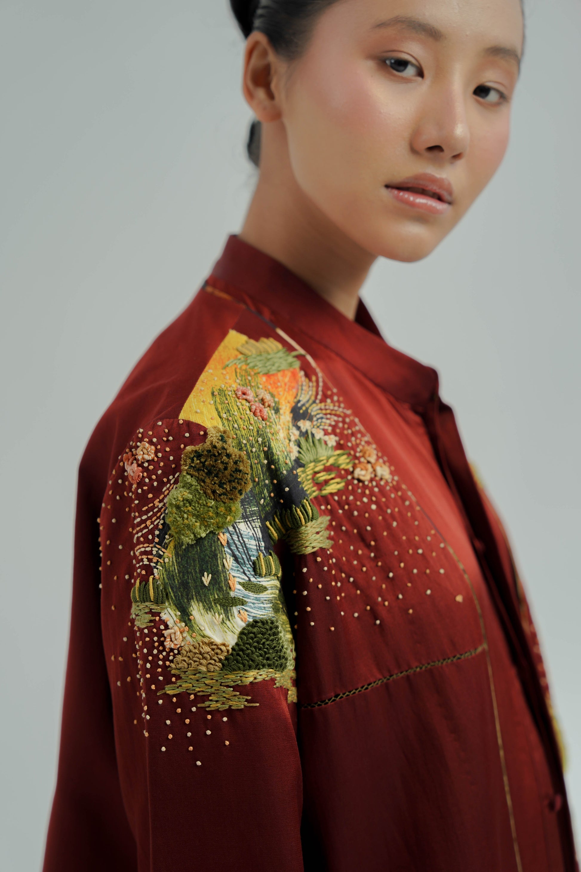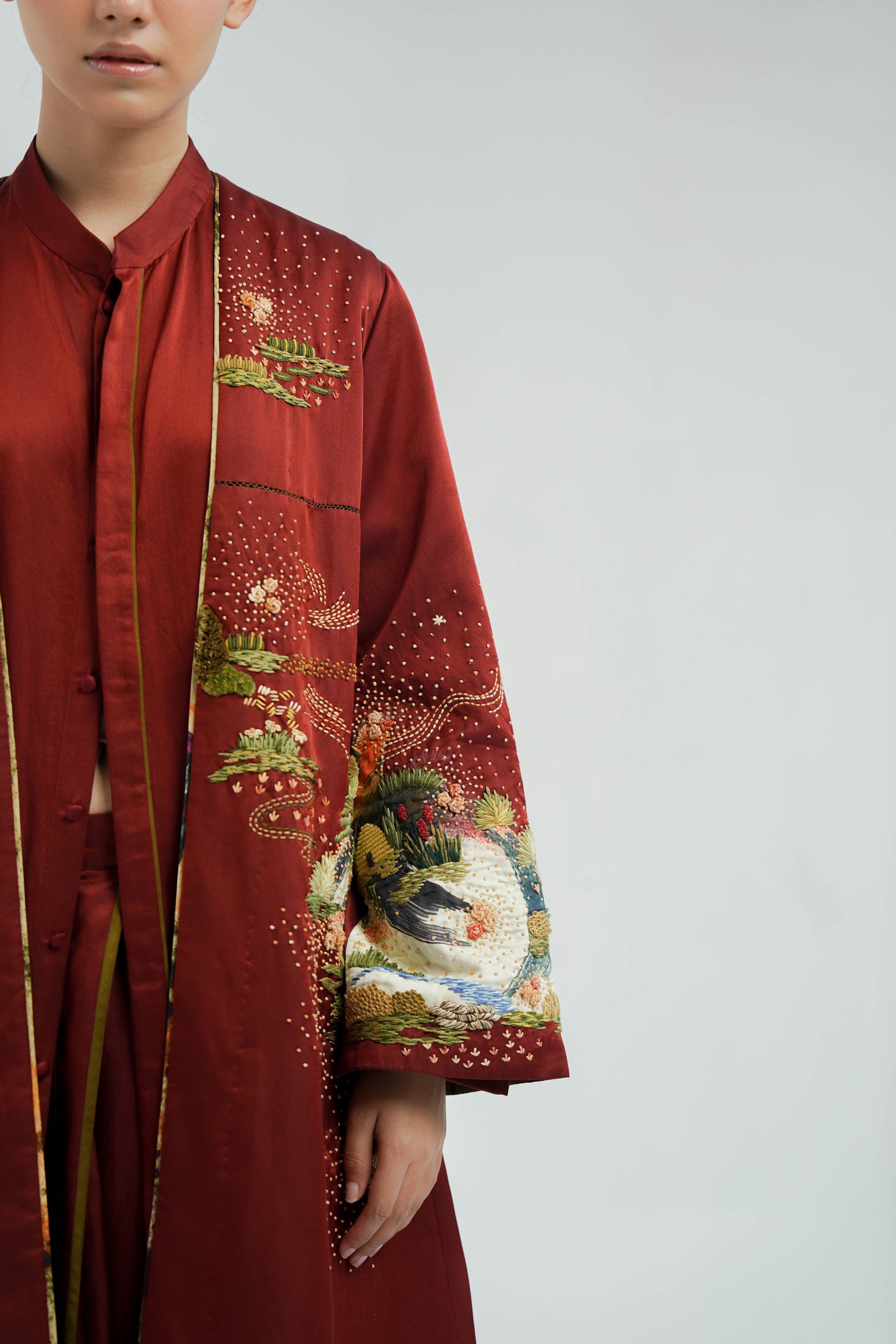 The Sakura co-ord set is crafted from silk. It features a plum handpainted digitally printed buta. The set includes a relaxed fit, front-open with pocket detailing and contrast plum piping finished with metal sequin edge finish.
