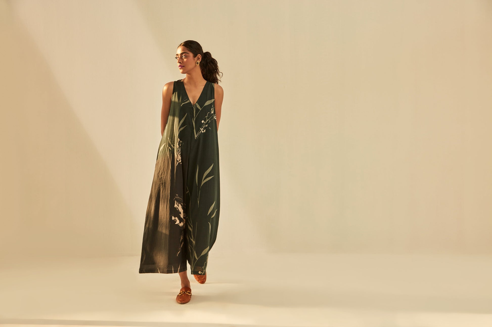 This jumpsuit symbolises refined grace. adorned with a classic floral print on a dark green base featuring a v neckline and front zipper opening, crafted in soft cotton mul. Handcrafted in India. Side seam pockets. Fully lined.