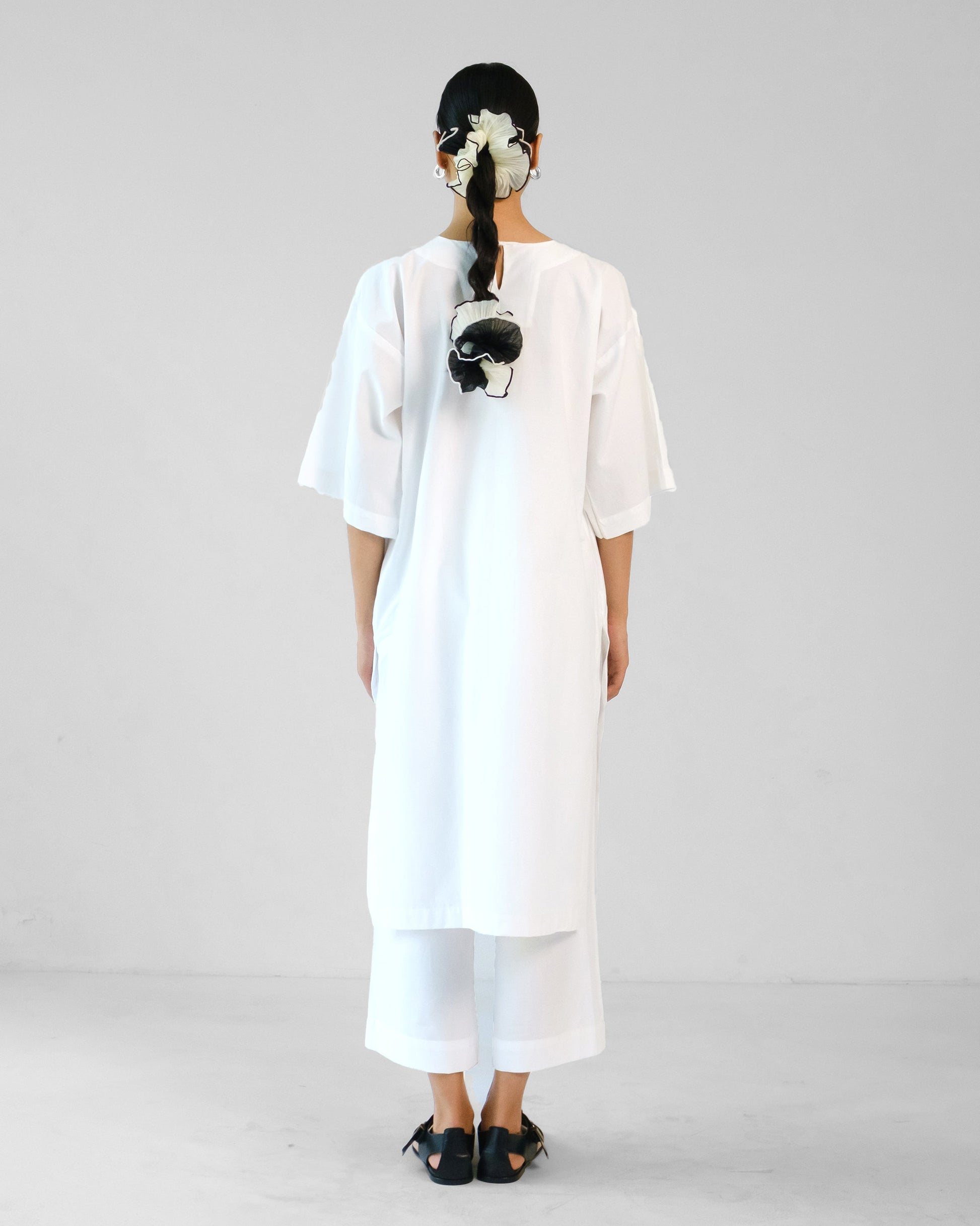 This minimal coord set features a tunic and pants in a stunning White colour, accented with delicate black colour Cross stitch embroidery details. Pant has a fully elasticated waist.